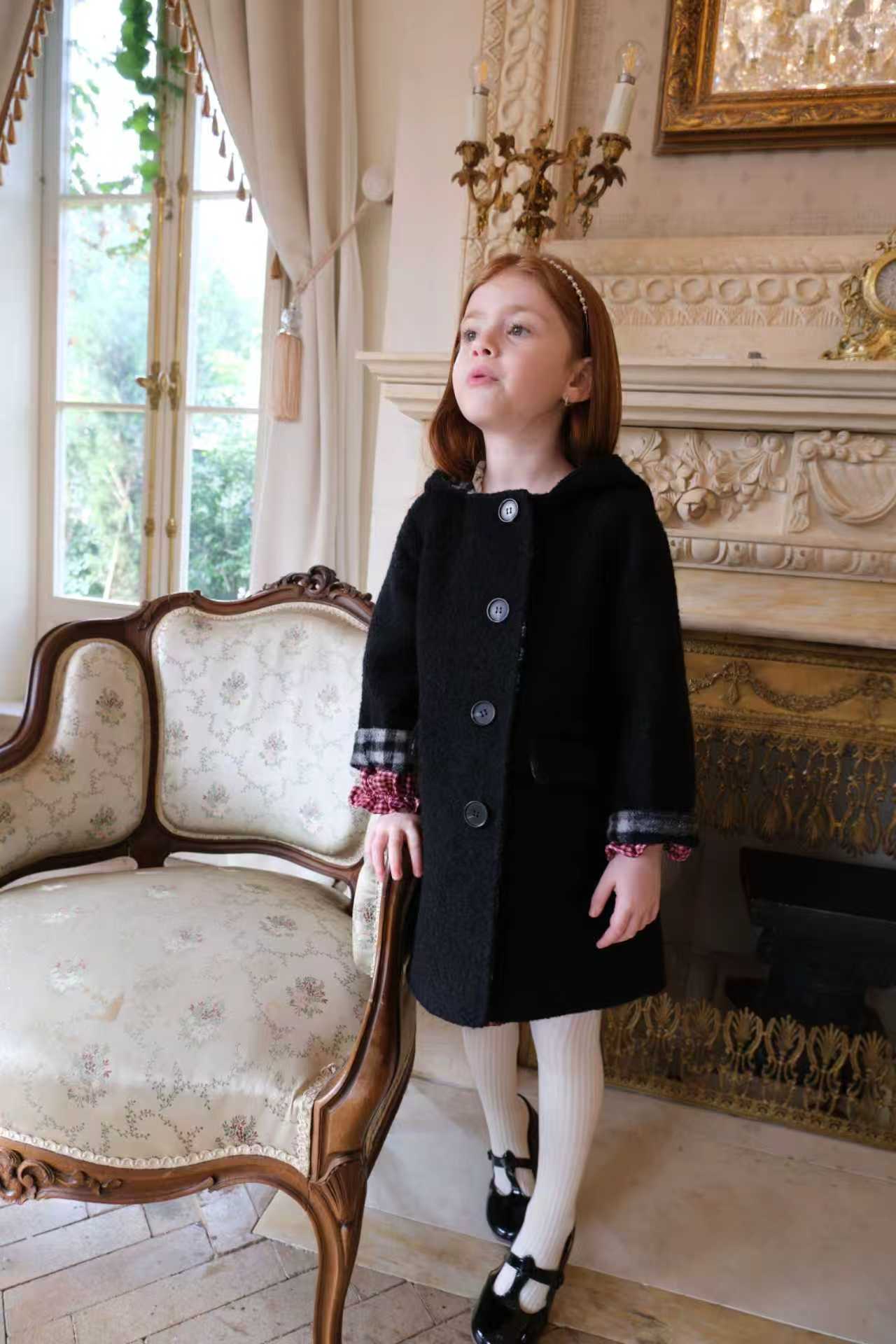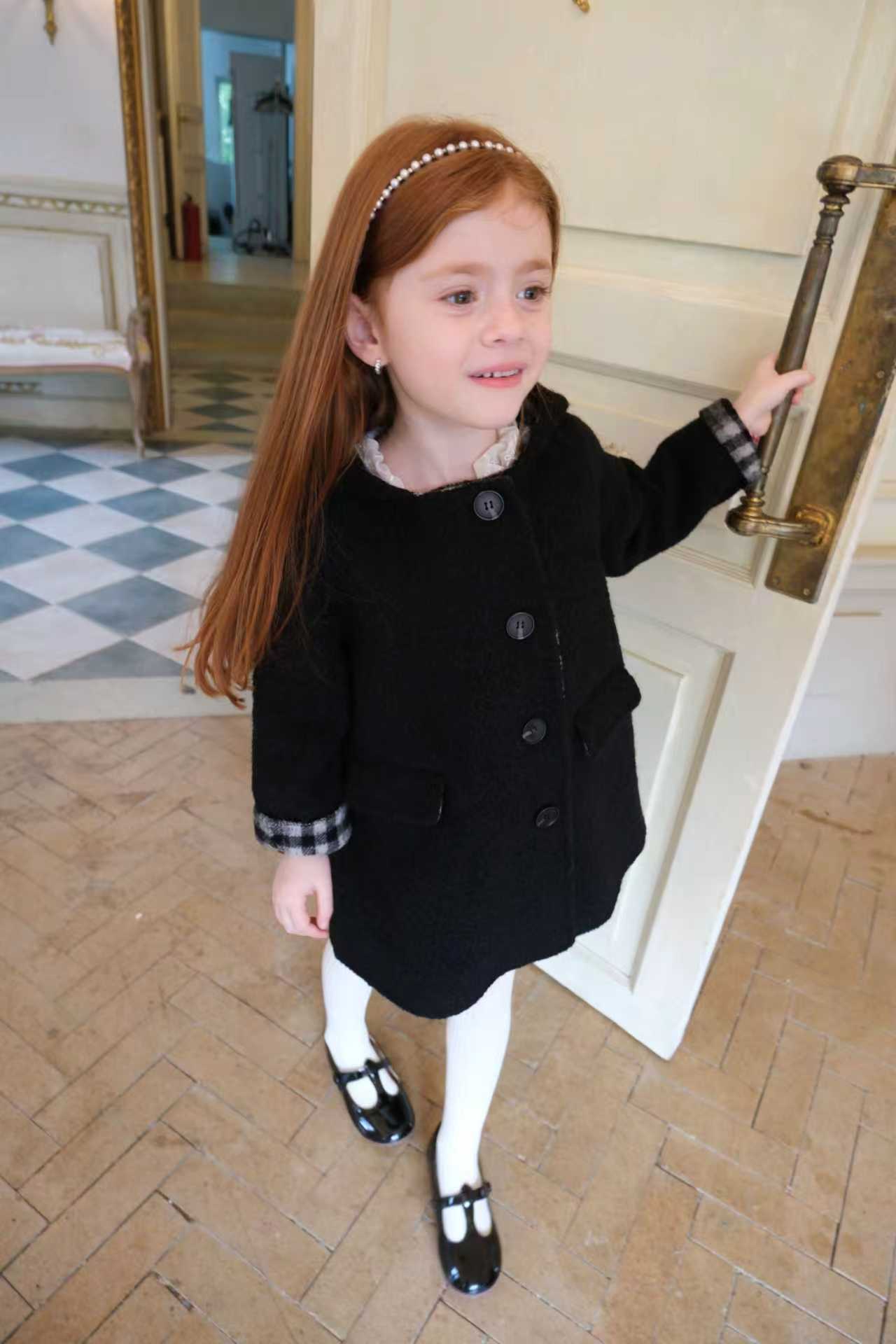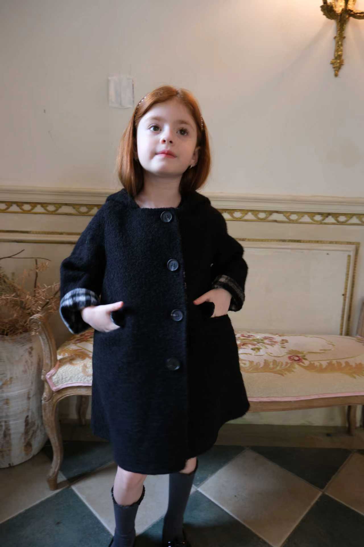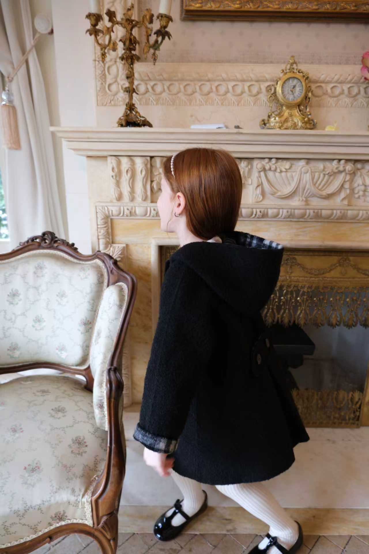 品名/Name:法式复古连帽大衣版型/Typography:宽松面料/Fabric:70%羊毛5%羊驼25%化纤颜色/Color:黑色