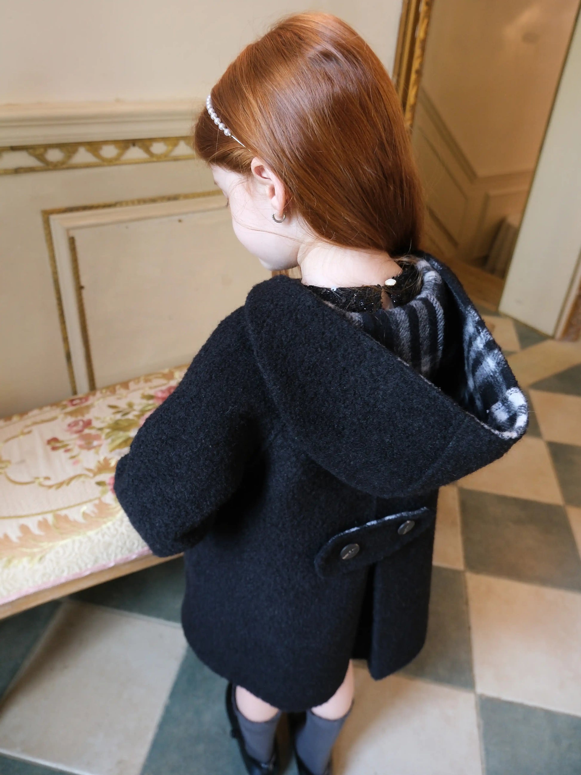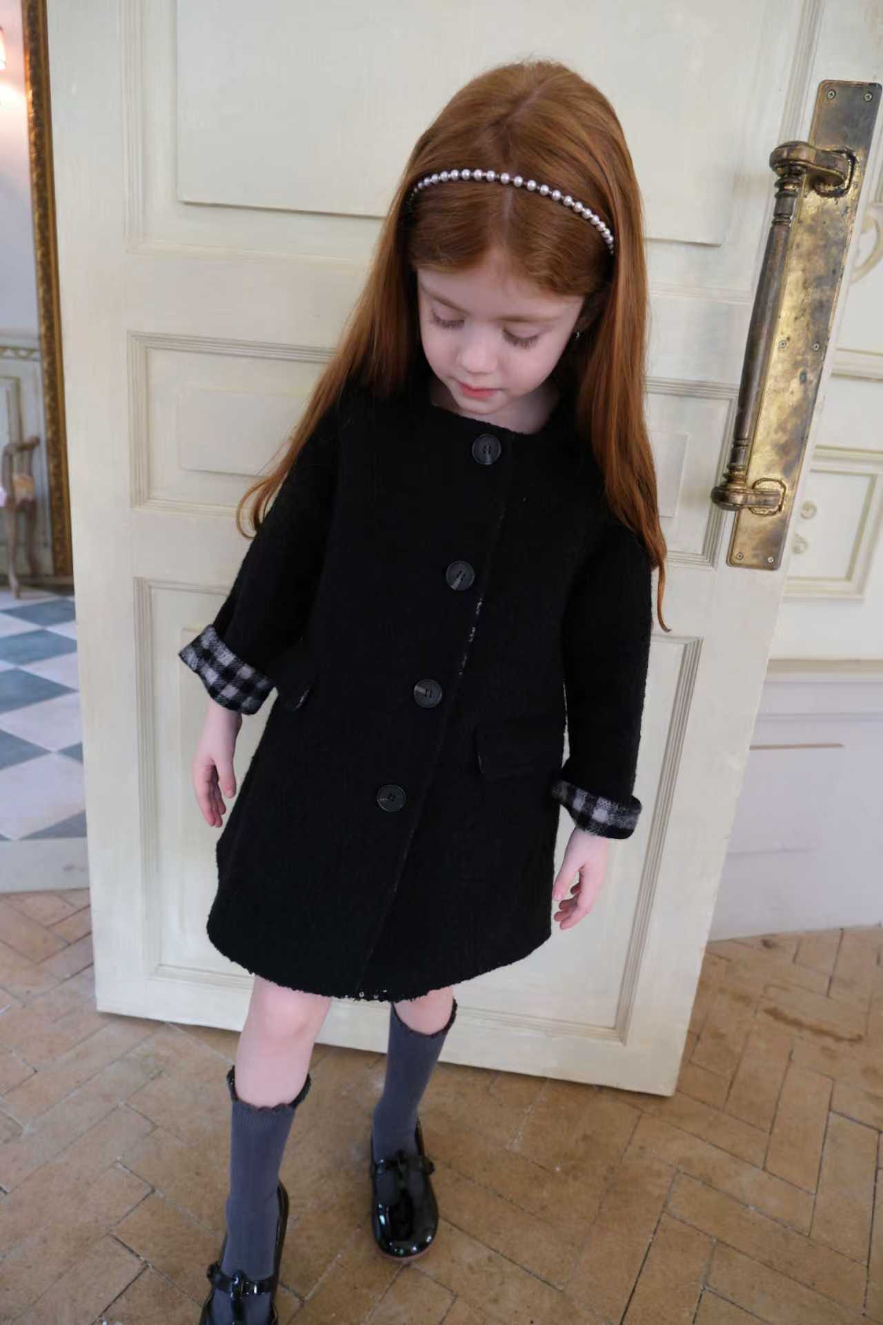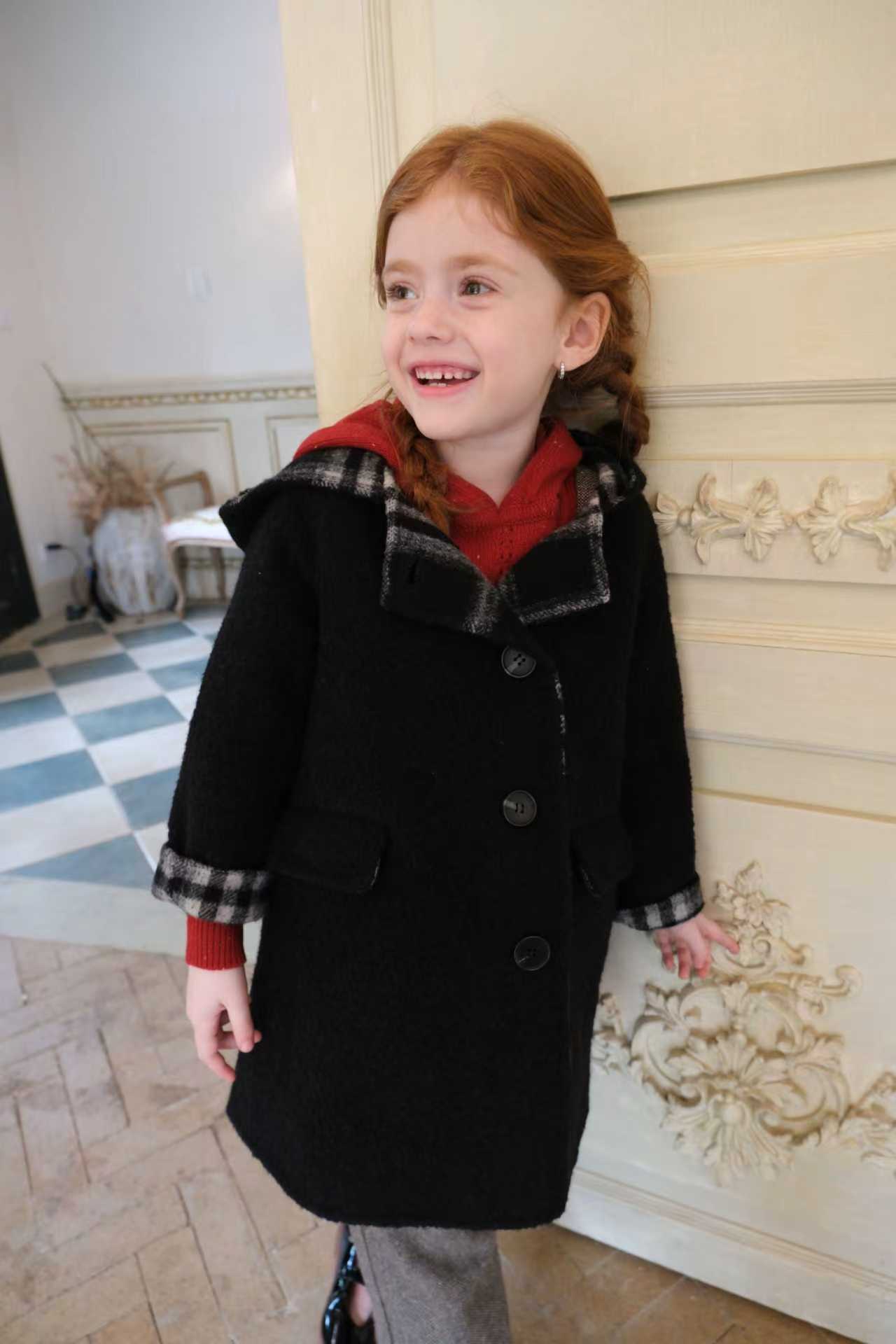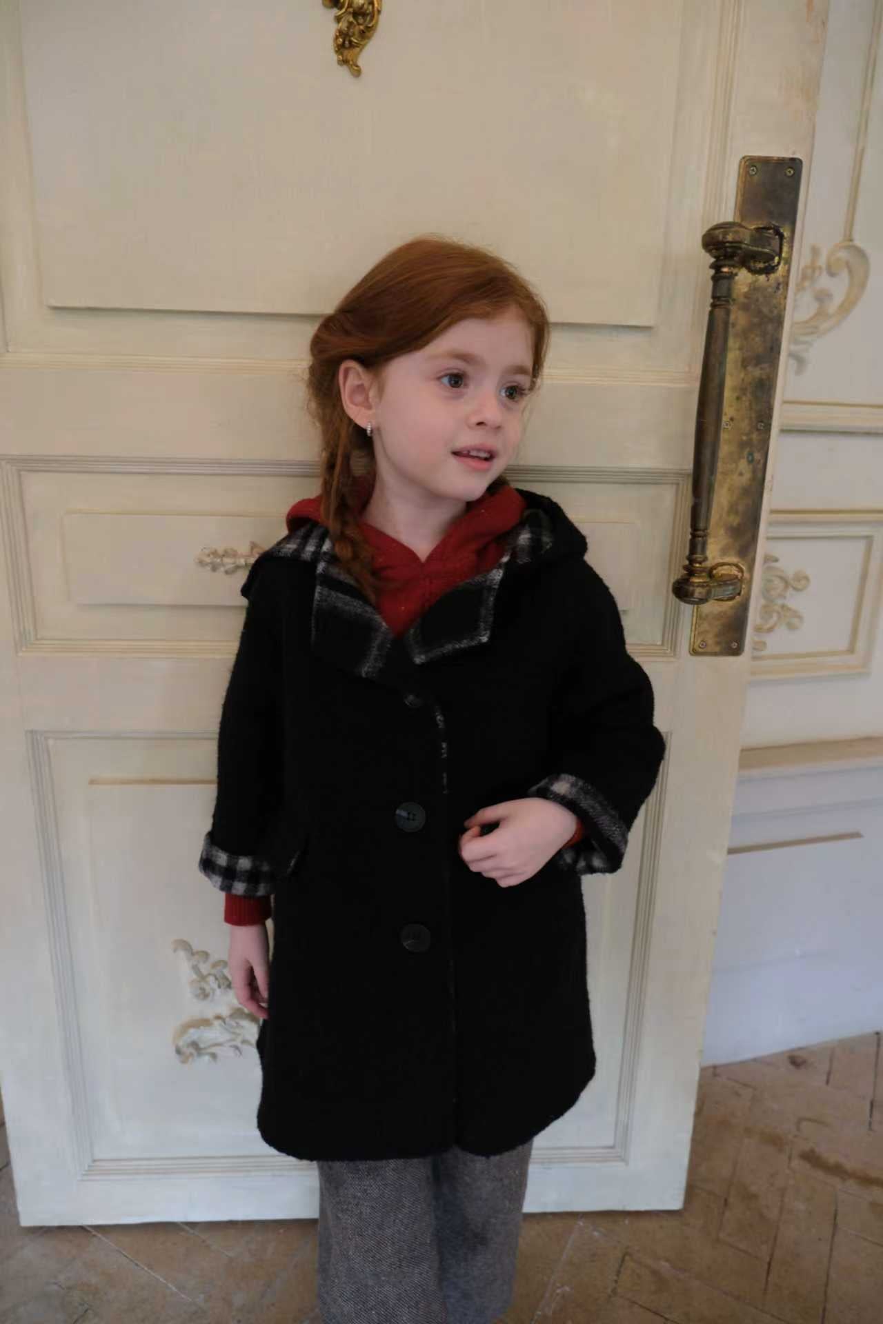品名/Name:法式复古连帽大衣版型/Typography:宽松面料/Fabric:70%羊毛5%羊驼25%化纤颜色/Color:黑色